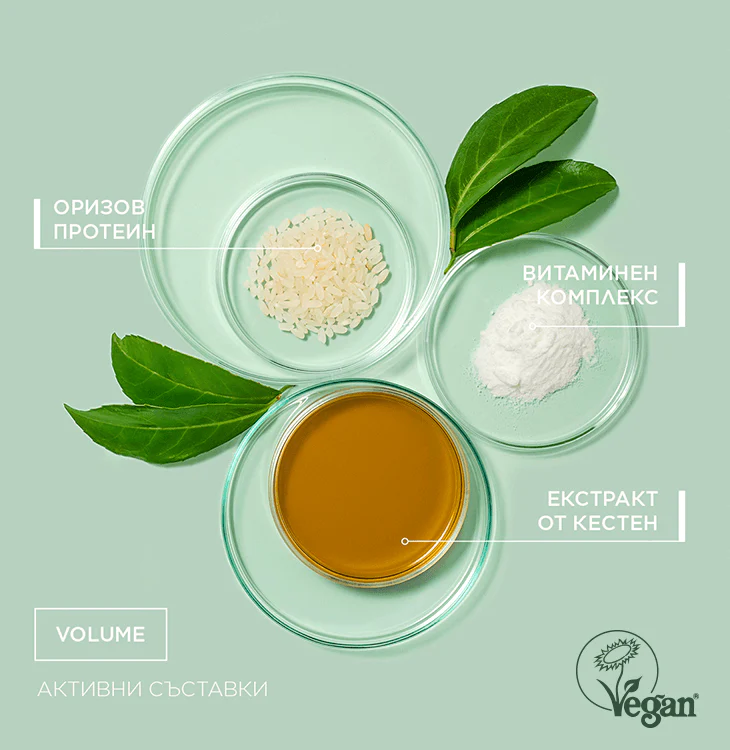 Нежен шампоан, богат на оризови протеини в комбинация с екстракт от кестен и витаминен комплекс А, Е, F, C, затворени в специална липозомна система. Деликатно почиства, без да пресушава косата и същевременно я подхранва от корена до върха. За блестяща, плътна коса с красив, естествен обем.